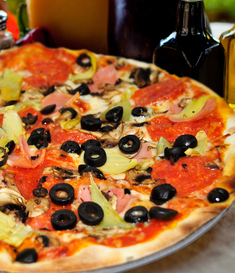 Tomate, mozzarella, peperoni y aceitunas verdes